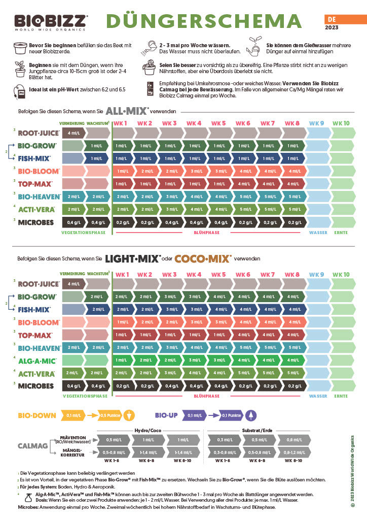 Mit Hilfe des BioBizz Düngeschema gelingt die Nährstoffversorgung deiner Planzen im Handumdrehen.