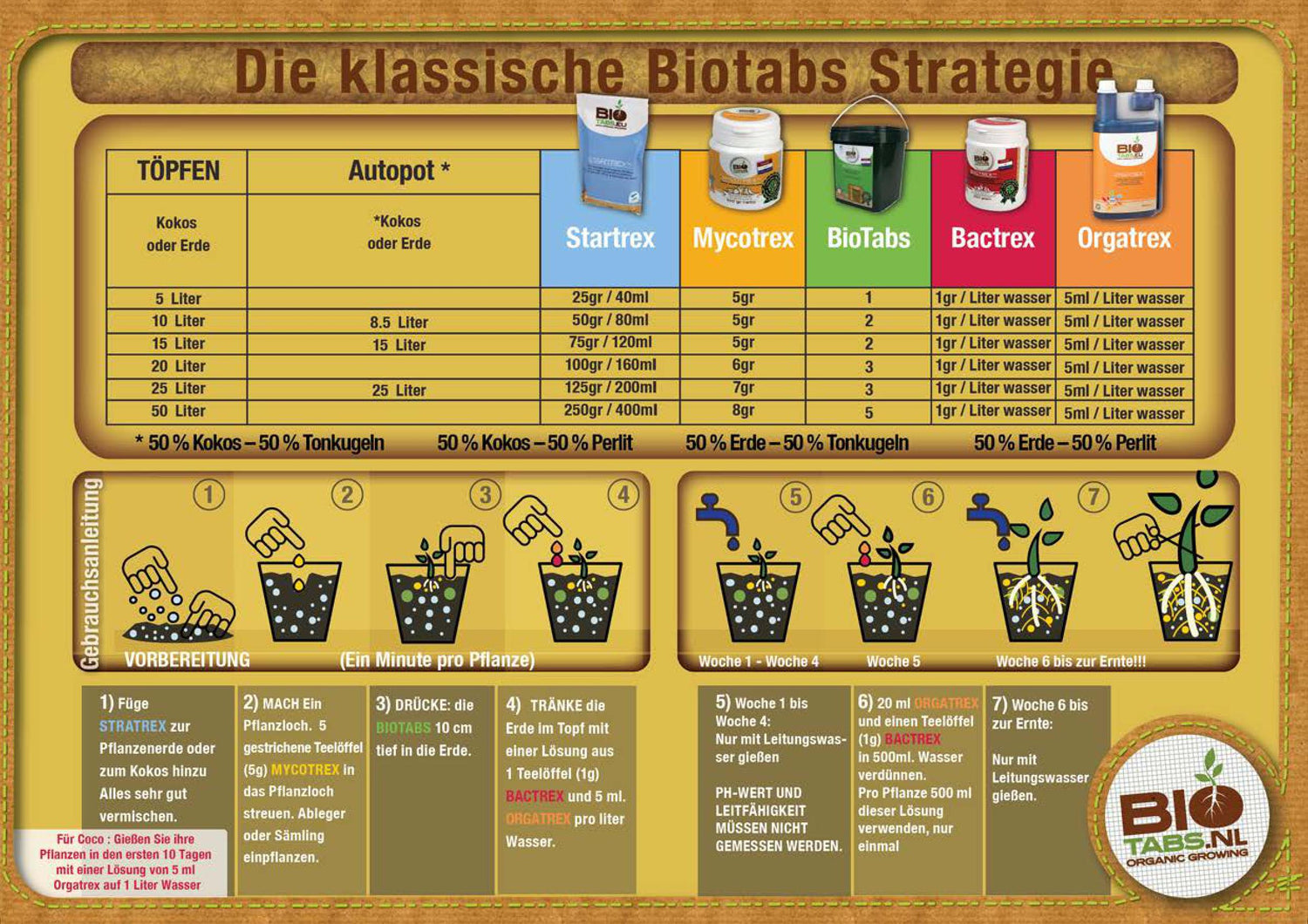 • STARTREX ist Teil der BioTabs ‘Organische Anbaumethode’. Für detaillierte Anweisungen und wie du die BioTabs-Produkte optimal nutzen kannst, empfehlen wir dir das BioTabs-Handbuch zu lesen.