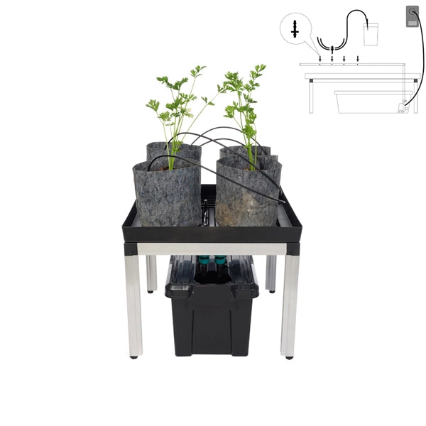 Die Ebbe-Flut-Bewässerung ist ein effizientes Bewässerungssystem, bei dem eine Wasserpumpe mit der Unterseite der Abtropfschale verbunden wird, auf der sich deine Pflanzen in Töpfen befinden. Die Pumpe wird zu festgelegten Zeiten, über die G-Tools Smartbox oder eine Zeitschaltuhr ein- und ausgeschaltet, um eine Wasserschicht in die Bodenschale zu pumpen. Nach dem Ausschalten fließt das Wasser zurück in den Wasserbehälter. Durch verstellbare Füße unter dem Tisch kann ein leichtes Gefälle erzeugt werden, damit die Abtropfschale nach der Bewässerung trocken laufen kann. Die Töpfe nehmen das Wasser durch Löcher im Boden auf. Dieses System ist auch ideal für Textiltöpfe geeignet.