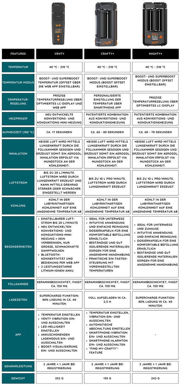 Kompakte und robuste Bauweise: Der CRAFTY+ überzeugt durch seine kompakte und dennoch robuste Bauweise. Hergestellt aus hochwertigen Materialien und mit deutscher Präzision verarbeitet, ist dieser Vaporizer für eine lange Lebensdauer und zuverlässige Leistung ausgelegt.
